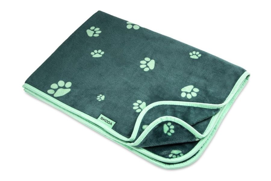 Die emerald-grüne Decke ist mit einem aufgedruckten Pfotenmotiv in Electric-Grün versehen. Am Rand befindet sich ein gewebtes Etikett mit Skoda-Logo.