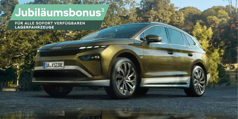 2 JubilĂ€umsbonus auf die unverbindliche Preisempfehlung der Ć koda Auto Deutschland GmbH fĂŒr sofort verfĂŒgbare Lagerwagen bei Abschluss eines Kauf-, Leasing- oder Finanzierungsvertrages bis zum 30.09.2025 bei teilnehmenden Ć koda Partnern. GĂŒltig bei Zulassung bis zum 31.10.2025 und nur solange der Vorrat reicht. Die Höhe des JubilĂ€umsbonus bestimmt sich nach dem Modell und dem freiwillig gewĂ€hrten Nachlass des teilnehmenden Ć koda Partners. Der Verkaufspreis wird allein vom Ć koda Partner festgesetzt.